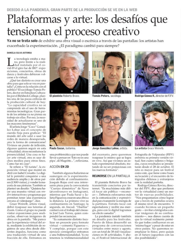 Newspaper El Mercurio features artist Coco González Lohse and his virtual exhibition El Turista, presented by Isabel Croxatto Galería, in an article on art and digital platforms.