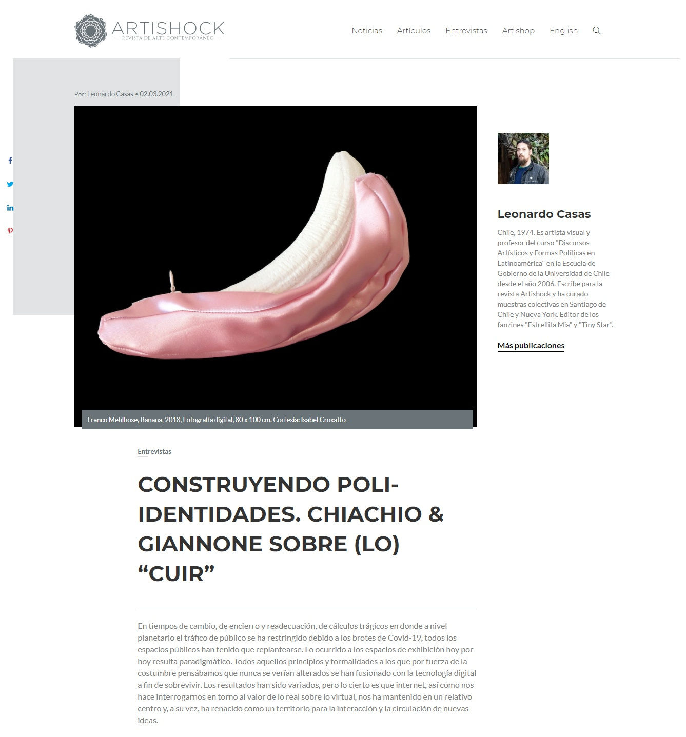 The influential Latin American contemporary art web magazine Artishock features and in-depth review of our latest virtual exhibition, CUIR, Curated by Chiachio & Giannone, and an interview with the curators, by artist and academic Leonardo Casas.