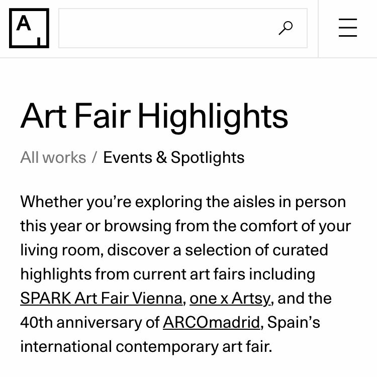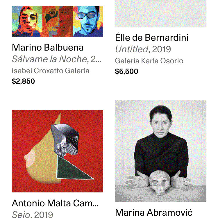 The collection consists of a handpicked selection of curated highlights from current art fairs presented on the platform chosen by Artsy’s Curatorial team, including the pieces Bomberos by Chiachio & Giannone, Sálvame la Noche by Marino Balbuena, and The Bad Seed by Víctor Castillo, along with artworks by the likes of Carlos Cruz-Diez, Marina Abramovic and Nan Goldin, among others.