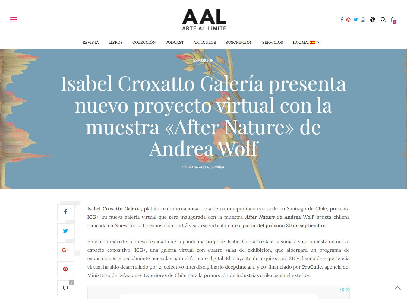 Art magazine Arte Al Límite features the opening of Isabel Croxatto Galería's new virtual exhibition space, ICG+, with After Nature by Andrea Wolf.